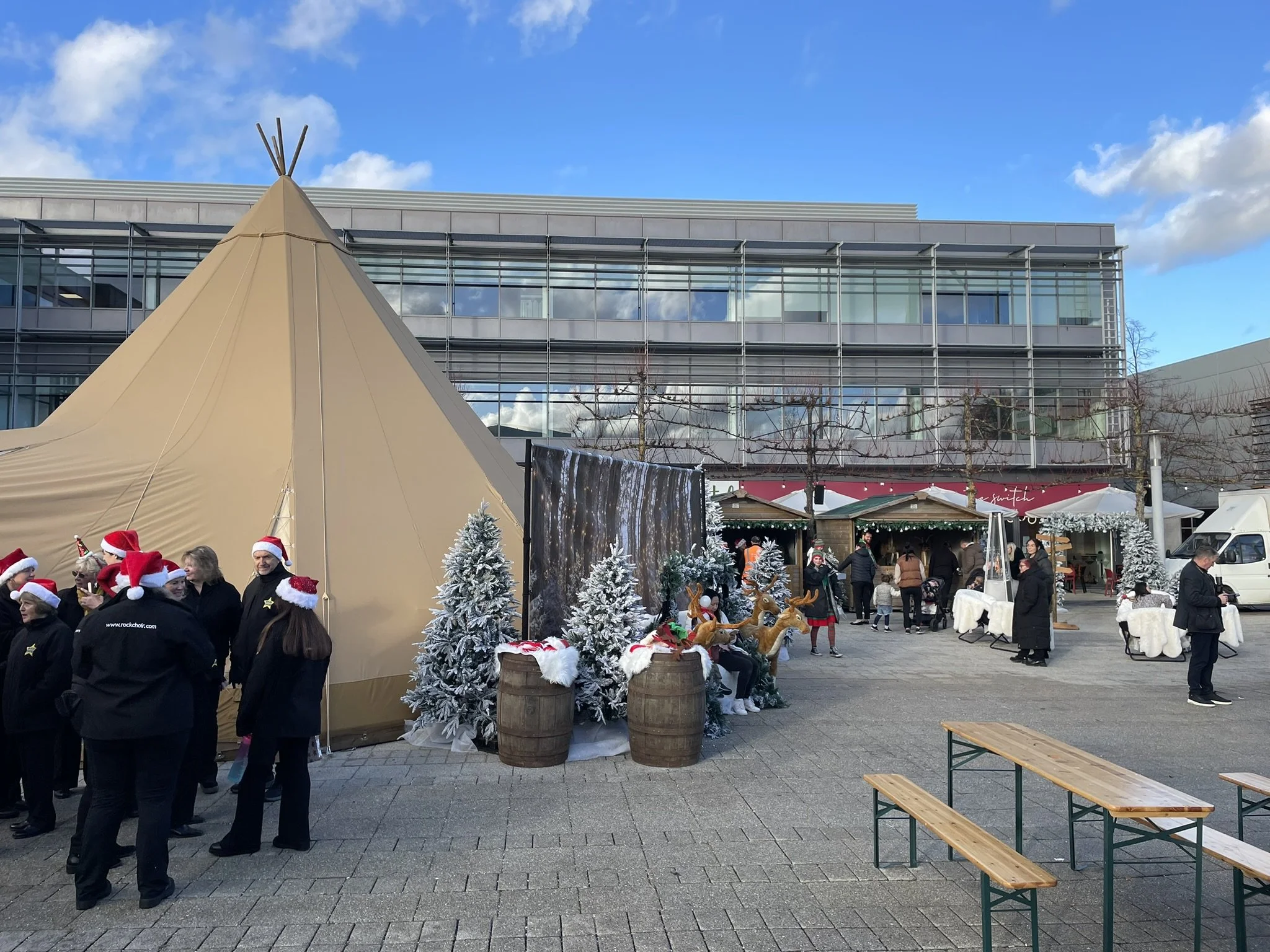 By offering different types of seating, the design encourages people to spend more time outdoors, supporting social interaction and seasonal activities throughout the winter period.